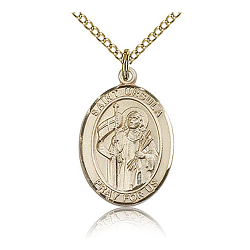 This gold-filled Saint Ursula medal includes a gold-plated sterling silver 18in lite curb chain with lobster clasp. 3/4in x 1/2in. This oval medal is the size of a penny. Inscription: SAINT URSULA MORE PRAY FOR US. Die struck, hand-finished. Made in USA.