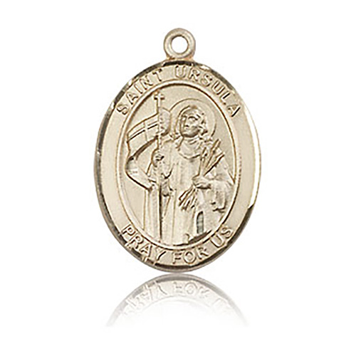 This ladies' 14k yellow gold oval St Ursula medal is die struck and hand-engraved. Inscription: SAINT URSULA PRAY FOR US. Dimensions: 3/4in x 1/2in. This item is the size of a penny. Made in USA.