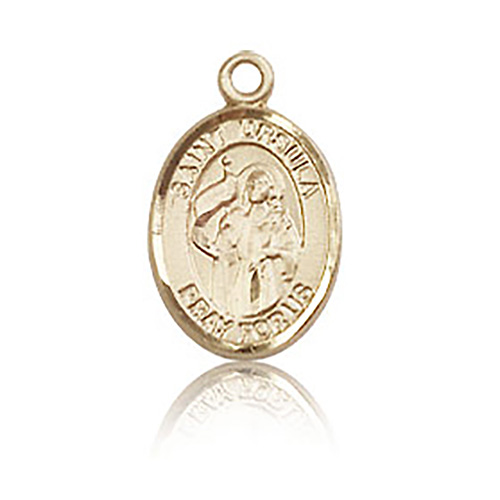 This very small oval St Ursula medal is made of polished 14k yellow gold. Inscription: SAINT URSULA PRAY FOR US. Dimensions: 1/2in x 1/4in. This item is half the size of a quarter. Made in USA.