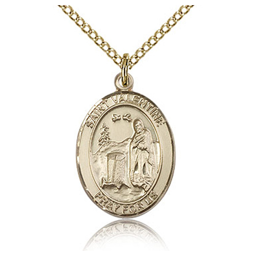 Die struck, hand-engraved medal. Inscription: SAINT VALENTINE PRAY FOR US. Free 18-inch sterling silver lite curb chain with lobster clasp. Dimensions: 3/4in x 1/2in. This item is the size of a penny. Made in USA.