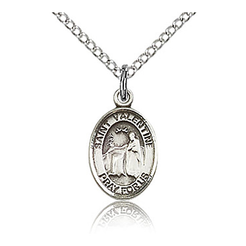 This very small sterling silver St Valentine charm dangles from an 18-inch sterling silver lite curb chain with lobster clasp. Dimensions: 1/2in x 1/4in. Plain back. This item is half the size of a quarter. Die struck, hand-engraved medal is made in USA.