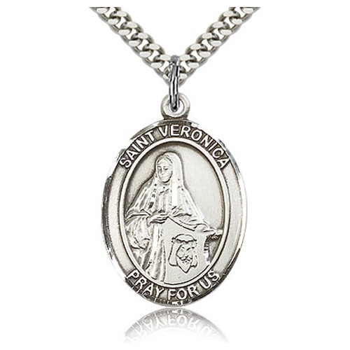 This sterling silver oval St Veronica medal is die struck and hand-engraved. Dimensions: 1in x 3/4in. 24-inch stainless steel, endless heavy curb chain with silver plating. Inscription: SAINT VERONICA PRAY FOR US. This item is the size of a quarter. Made in USA.