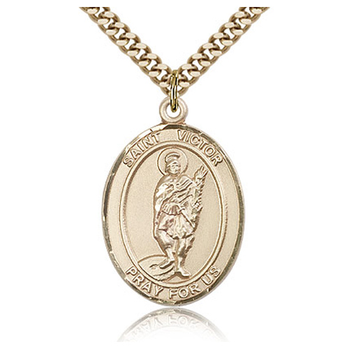 Gold filled sterling silver oval St Victor medal dangles from a 24-inch stainless steel, endless heavy curb chain with gold plating. Die struck, hand-engraved. Inscription: SAINT VICTOR PRAY FOR US. Dimensions: 1in x 3/4in. This item is the size of a quarter. Made in USA.