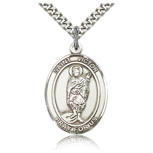 Men's sterling silver St Victor medal necklace is die struck and hand-engraved. Inscription: SAINT VICTOR PRAY FOR US. 24-inch stainless steel, endless heavy curb chain with silver plating. Dimensions: 1in x 3/4in. This item is the size of a quarter. Made in USA.