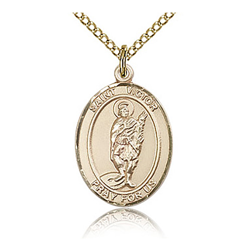 This gold-filled Saint Thomas More medal has a gold-plated sterling silver 18in lite curb chain with lobster clasp. Inscription: SAINT VICTOR PRAY FOR US. Item size: 3/4in x 1/2in. This medal is the size of a penny. Die struck, hand-finished. Made in USA.