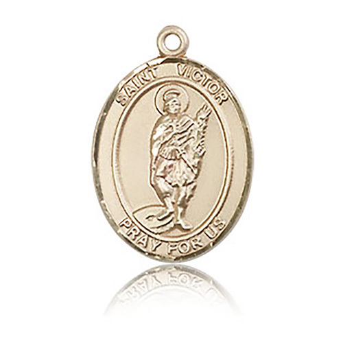 This ladies' 14k yellow gold oval St Victor medal is die struck and hand-engraved. Inscription: SAINT VICTOR PRAY FOR US. Dimensions: 3/4in x 1/2in. This item is the size of a penny. Made in USA.