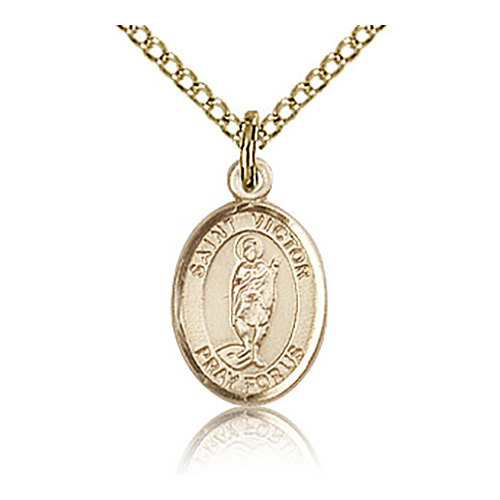 Die struck, hand-engraved St Victor charm is made of gold filled sterling silver. 18-inch gold plated, sterling silver lite curb chain with lobster clasp. Plain back. Dimensions: 1/2in x 1/4in. This item is half the size of a quarter. Made in USA.