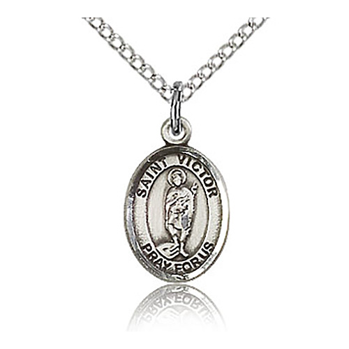 Die struck, hand-engraved St Victor charm dangles from a sterling silver 18-inch lite curb chain with lobster clasp. Plain back. Dimensions: 1/2in x 1/4in. This item is half the size of a quarter. Made in USA.