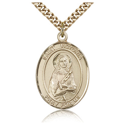 Gold filled sterling silver oval St Victoria medal dangles from a 24-inch stainless steel, endless heavy curb chain with gold plating. Die struck, hand-engravedl. Inscription: SAINT VICTORIA PRAY FOR US. Dimensions: 1in x 3/4in. This item is the size of a quarter. Made in USA.
