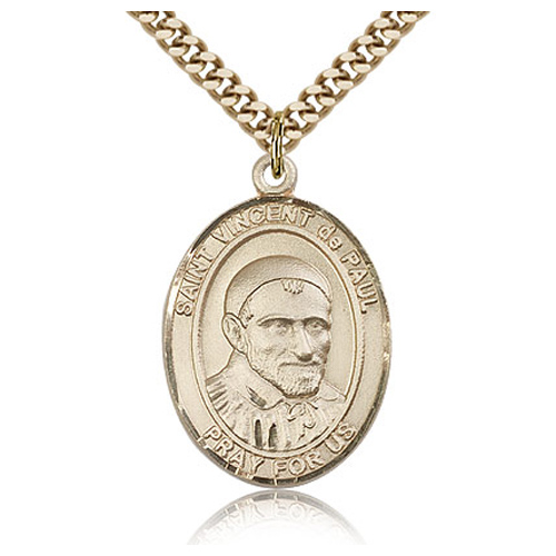 Die struck, hand-engraved medal. Inscription: SAINT VINCENT de PAUL PRAY FOR US. 24-inch stainless steel, endless heavy curb chain with gold plating. Dimensions: 1in x 3/4in. This item is the size of a quarter. Made in USA.