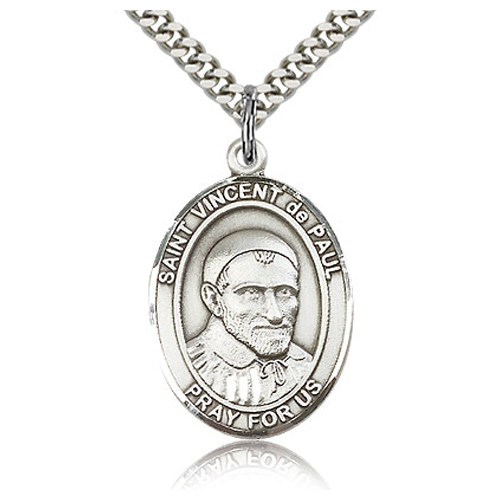 Sterling silver oval St Vincent de Paul medal dangles from a 24-inch stainless steel, endless heavy curb chain with silver plating. Dimensions: 1in x 3/4in. This item is the size of a quarter. Die struck, hand-engraved medal. Inscription: SAINT VINCENT de PAUL PRAY FOR US. Made in USA.