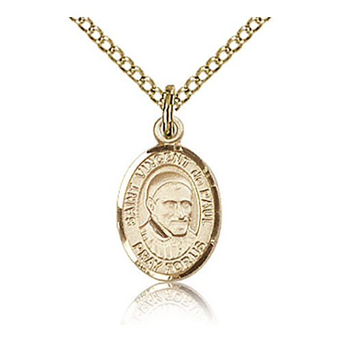 This very small oval St Vincent de Paul charm is made of gold filled sterling silver. 18-inch gold plated, sterling silver lite curb chain with lobster clasp. Plain back. Dimensions: 1/2in x 1/4in. This item is half the size of a quarter. Die struck, hand-engraved. Made in USA.