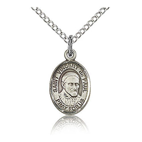 Die struck, hand-engraved St Vincent de Paul charm. 18-inch sterling silver lite curb chain with lobster clasp. Plain back. Dimensions: 1/2in x 1/4in. This item is half the size of a quarter. Made in USA.