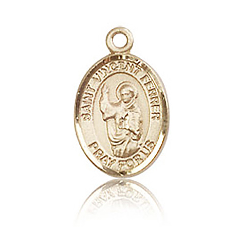 Die struck, hand-engraved medal is made of polished, solid 14kt yellow gold. Inscription: SAINT VINCENT FERRER PRAY FOR US. Dimensions: 1/2in x 1/4in. This item is half the size of a quarter. Made in USA.