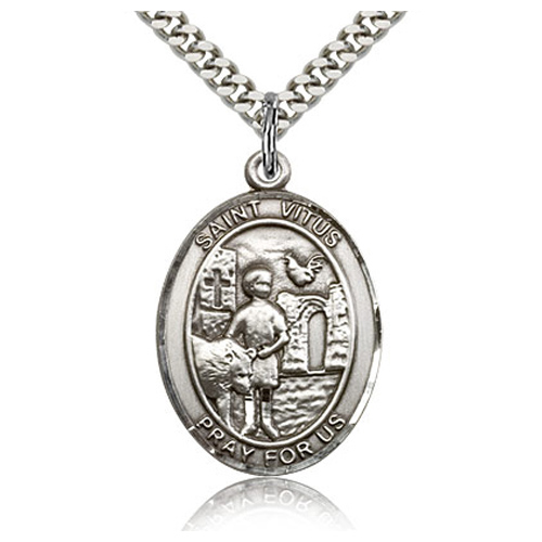 Sterling silver St Vitus medal dangles from a 24-inch stainless steel, endless heavy curb chain with silver plating. Dimensions: 1in x 3/4in. This item is the size of a quarter. Die struck, hand-engraved medal. Inscription: SAINT VITUS PRAY FOR US. Made in USA.