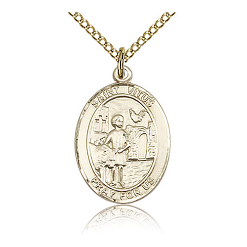 Gold filled oval St Vitus medal dangles from a gold-plated sterling silver 18in chain. Inscription: SAINT VITUS PRAY FOR US. Dimensions: 3/4in x 1/2in. This item is the size of a penny. Die struck, hand-engraved medal. Made in USA.
