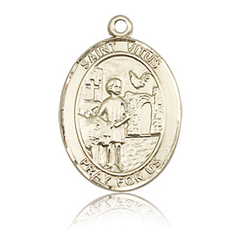Die struck, hand-engraved St Vitus medal is made of polished, solid 14kt yellow gold. Inscription: SAINT VITUS PRAY FOR US. Dimensions: 3/4in x 1/2in. This item is the size of a penny. Made in USA.