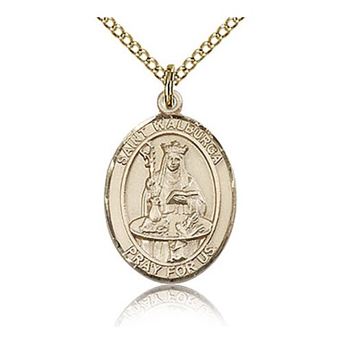 This gold-filled Saint Walburga medal includes a gold-plated sterling silver 18in lite curb chain with lobster clasp. Inscription: SAINT WALBURGA PRAY FOR US. Item size: 3/4in x 1/2in. This oval medal is the size of a penny. Die struck, hand-finished. Made in USA.