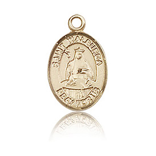 This very small oval St Walburga medal is made of polished 14k yellow gold. Inscription: SAINT WALBURGA PRAY FOR US. Dimensions: 1/2in x 1/4in. This item is half the size of a quarter. Made in USA.