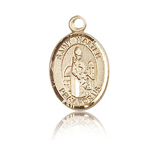 This very small St Walter medal is made of polished, solid 14kt yellow gold. Inscription: SAINT WALTER PRAY FOR US. Dimensions: 1/2in x 1/4in. This item is half the size of a quarter. Die struck, hand-engraved. Made in USA.