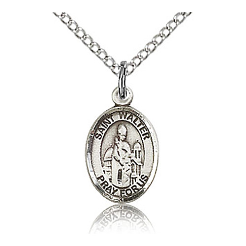 Die struck, hand-engraved St Walter charm. Free 18-inch sterling silver lite curb chain with lobster clasp. Plain back. Dimensions: 1/2in x 1/4in. This item is half the size of a quarter. Made in USA.