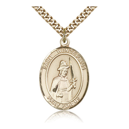 Gold filled sterling silver oval St Wenceslaus medal dangles from a 24-inch stainless steel, endless heavy curb chain with gold plating. Die struck, hand-engraved. Inscription: SAINT WENCESLAUS PRAY FOR US. Dimensions: 1in x 3/4in. This item is the size of a quarter. Made in USA.