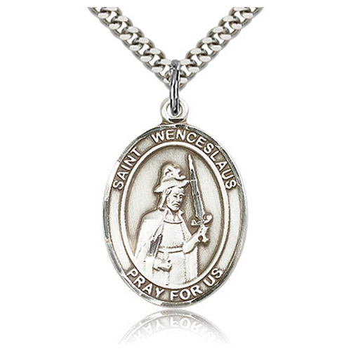 This men's St. Wenceslaus medal is made of antiqued sterling silver and comes with a 24-inch stainless steel, endless heavy curb chain with silver plating. Inscription: SAINT WENCESLAUS PRAY FOR US. Dimensions: 1in x 3/4in. This item is the size of a quarter. Die struck, hand-engraved medal. Made in USA.