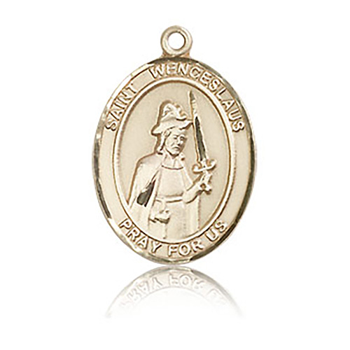 This ladies' 14k yellow gold oval St Wenceslaus medal is die struck and hand-engraved. Inscription: SAINT WENCESLAUS PRAY FOR US. Dimensions: 3/4in x 1/2in. This item is the size of a penny. Made in USA.