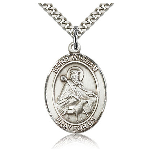 Die struck, hand-engraved oval St William medal is made of sterling silver. 24-inch stainless steel, endless heavy curb chain with silver plating. Dimensions: 1in x 3/4in. This item is the size of a quarter. Inscription: SAINT WILLIAM PRAY FOR US. Made in USA.