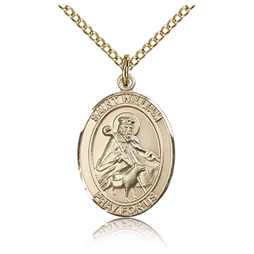 This ladies' gold filled sterling silver oval St William medal has a polished finish. Inscription: SAINT WILLIAM PRAY FOR US. 18-inch sterling silver lite curb chain with lobster clasp. Dimensions: 3/4in x 1/2in. This item is the size of a penny. Die struck, hand-engraved medal. Made in USA.