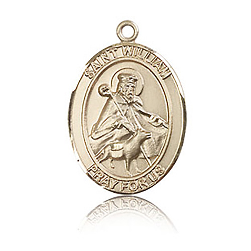 14k yellow gold oval St William medal is die struck and hand-engraved. Inscription: SAINT WILLIAM PRAY FOR US. Dimensions: 3/4in x 1/2in. This item is the size of a penny. Made in USA.