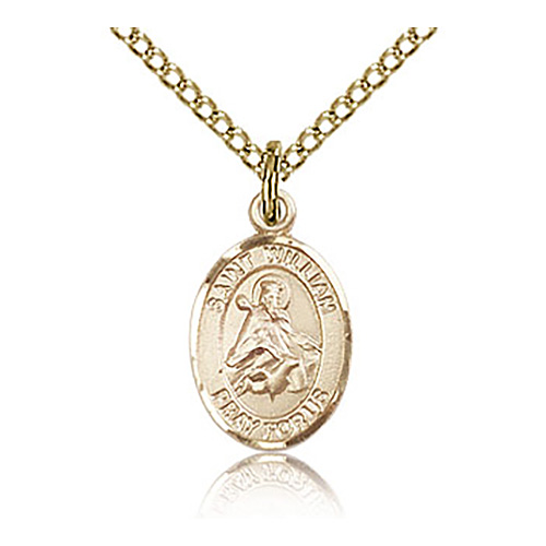 This extra small St William charm is made of gold filled sterling silver. It dangles from a gold plated, sterling silver 18-inch curb chain with lobster clasp. Plain back. Dimensions: 1/2in x 1/4in. This item is half the size of a quarter. Die struck, hand-engraved. Made in USA.