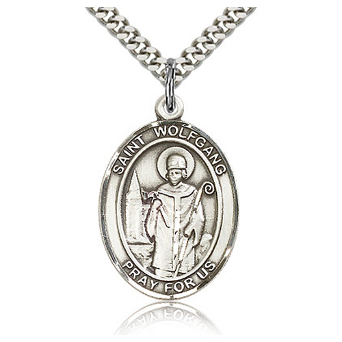 Sterling silver St Wolfgang medal dangles from a stainless steel, 24-inch endless heavy curb chain with silver plating. Dimensions: 1in x 3/4in. This item is the size of a quarter. Die struck, hand-engraved. Inscription: SAINT WOLFGANG PRAY FOR US. Made in USA.