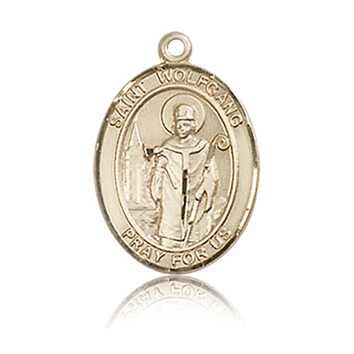 Die struck, hand-engraved St. Wolfgang medal is made of polished, solid 14kt yellow gold. Inscription: SAINT WOLFGANG PRAY FOR US. Dimensions: 3/4in x 1/2in. This item is the size of a penny. Made in USA.