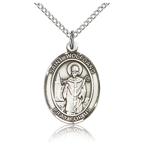 Sterling silver oval Wolfgang medal has a sterling silver 18in curb chain with lobster clasp. 3/4in x 1/2in. This medal is the size of a penny. Inscription: SAINT WOLFGANG PRAY FOR US. Die struck, hand-finished. Made in USA.