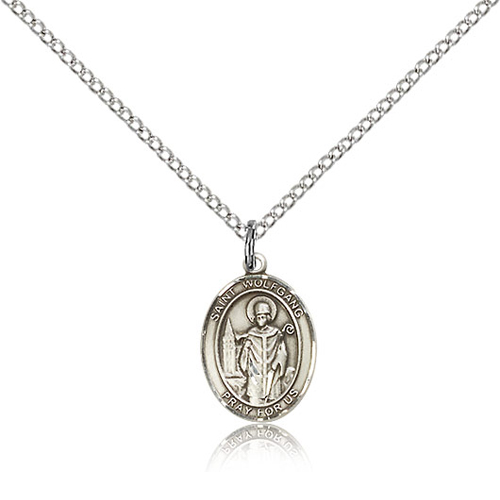 Die struck, hand-engraved St Wolfgang charm. Free 18-inch sterling silver lite curb chain with lobster clasp. Plain back. Dimensions: 1/2in x 1/4in. This item is half the size of a quarter. Made in USA.