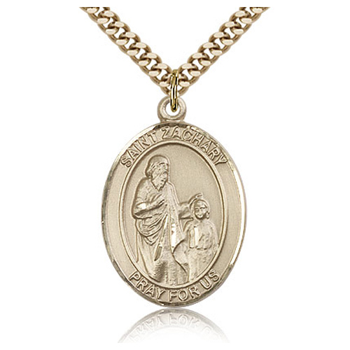 Die struck, hand-engraved medal. Inscription: SAINT ZACHARY PRAY FOR US. 24-inch stainless steel, endless heavy curb chain with gold plating. Dimensions: 1in x 3/4in. This item is the size of a quarter. Made in USA.