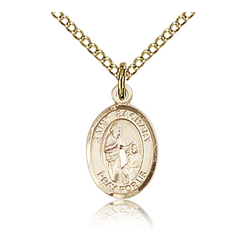 This small oval St Zachary charm is made of gold filled sterling silver. 18-inch gold plated, sterling silver lite curb chain with lobster clasp. Plain back. Dimensions: 1/2in x 1/4in. This item is half the size of a quarter. Die struck, hand-engraved. Made in USA.