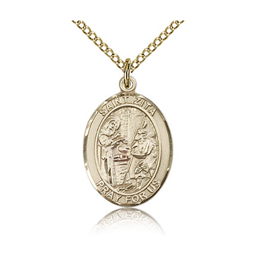 This gold-filled Saint Zita medal includes a gold-plated sterling silver 18in lite curb chain with lobster clasp. Inscription: SAINT ZITA PRAY FOR US. Item size: 3/4in x 1/2in. This oval medal is the size of a penny. Die struck, hand-finished. Made in USA.