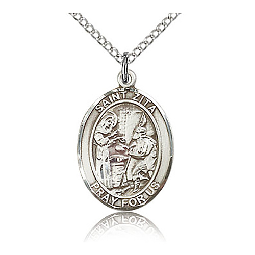 This sterling silver Saint Zita medal includes a sterling silver 18in lite curb chain with lobster clasp. Inscription: SAINT ZITA PRAY FOR US. Item size: 3/4in x 1/2in. This oval medal is the size of a penny. Die struck, hand-finished. Made in USA.