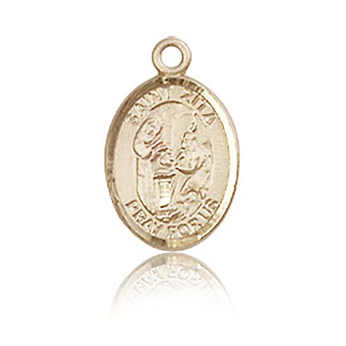 This very small oval St Zita medal is made of solid 14k yellow gold. Inscription: SAINT ZITA PRAY FOR US. Dimensions: 1/2in x 1/4in. This item is half the size of a quarter. Die struck, hand-engraved. Made in USA.
