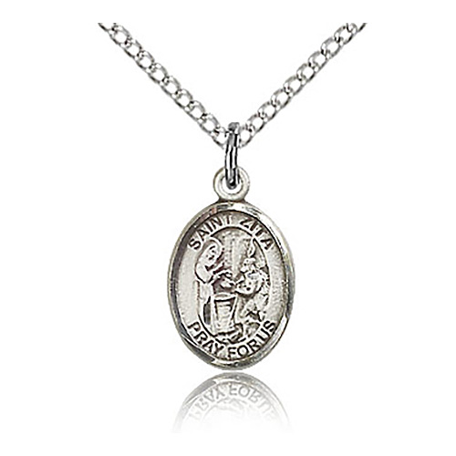 This very small sterling silver oval St Zita charm dangles from a sterling silver 18in lite curb chain with lobster clasp. Dimensions: 1/2in x 1/4in. Plain back. This item is half the size of a quarter. Die struck, hand-engraved. Made in USA.