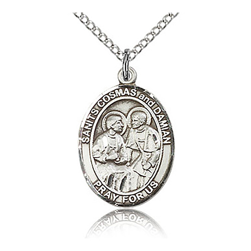 This sterling silver Saints Cosmas and Damian medal dangles from a sterling silver 18in lite curb chain with lobster clasp. Item size: 3/4in x 1/2in. This oval medal is the size of a penny. Inscription: SAINT COSMAS and DAMIAN PRAY FOR US. Die struck, hand-finished. Made in USA.