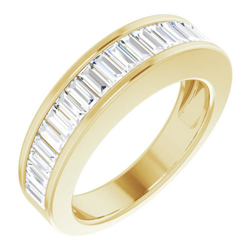 14k yellow gold wedding band is set with 1 carat total weight baguette diamonds. This diamond wedding band features 24 channel-set straight baguette diamonds: SI2 clarity, G-H color. All diamonds are hand selected to match for color and clarity. Total carat weight approximately 1 CT. Flat edges. Size 7 band weighs approximately 6.22 grams. Item top width: 5.39mm; side width: 4.12mm; bottom width: 3.63mm.