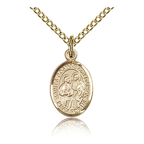 This very small oval St Cosmas and Damian charm is made of gold filled sterling silver. 18-inch gold plated, sterling silver lite curb chain with lobster clasp. Plain back. Dimensions: 1/2in x 1/4in. This item is half the size of a quarter. Die struck, hand-engraved. Made in USA.