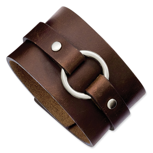This men's genuine brown leather bracelet features a stainless steel buckle. Push clasp. Length: 8 3/4in, width: 1 3/4in. One size fits most. Imported.