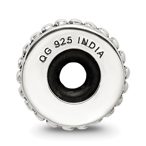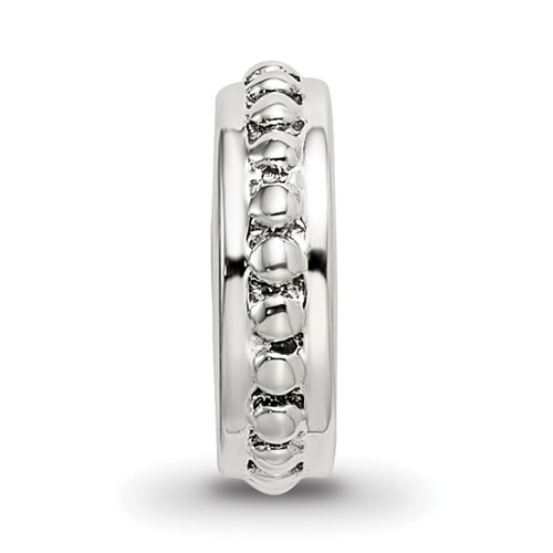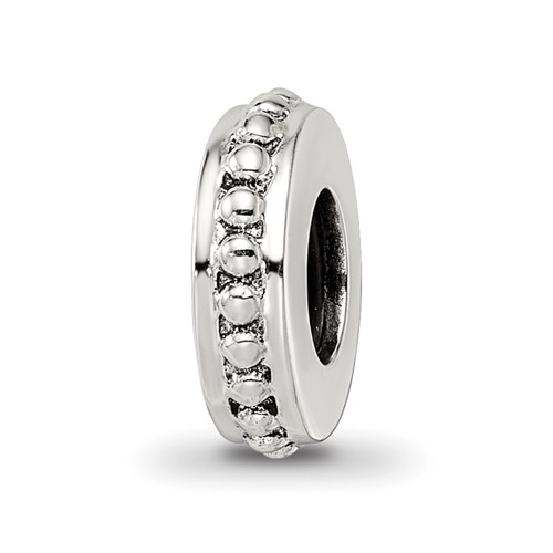 Polished, sterling silver stopper spacer bead has a beaded texture. Import. Not compatible with other brands besides Reflection Beads. This bead is lined with a rubber gasket that can be used anywhere on your chain or cord to keep beads from sliding. Bead size: 10mm x 2.7mm. Bead opening: 4mm.