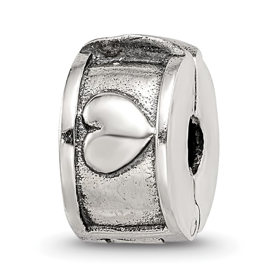 Hinged heart clip bead is made of antiqued, solid sterling silver. Versatile bead opens to clip anywhere on your chain or cord. It holds tightly to prevent beads from sliding.