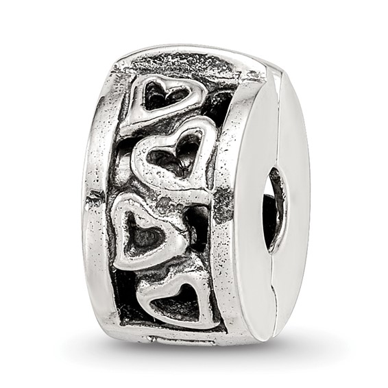 Hinged hearts clip bead is made of antiqued, solid sterling silver. Versatile bead opens to clip anywhere on your chain or cord. It holds tightly to prevent beads from sliding.