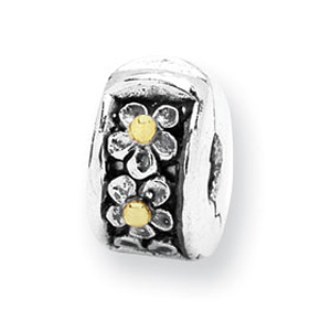 This hinged floral clip bead is made of antiqued sterling silver and 14kt yellow gold. Bead size: 11.8mm x 5.4mm. This bead opens to clip anywhere on your chain or cord. It holds tightly to prevent beads from sliding. This Reflection bead fits all major modular bracelet brands. Import.